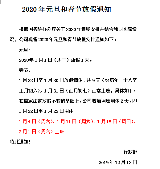 2020年元旦及春節放假公告