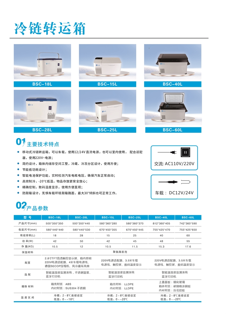 BSC系列冷鏈轉(zhuǎn)運(yùn)箱可以車載,使用12/24V直流電源,也可以室內(nèi)使用,配合適配器,使用220V~電源;