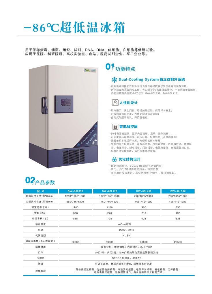 -86°C超低溫冰箱用于保存病毒、病菌、組織、試劑、DNA、RNA、紅細(xì)胞、自細(xì)胞等低溫試驗(yàn)等。 應(yīng)用于醫(yī)院、科研院所、高校實(shí)驗(yàn)室、血站、醫(yī)藥試劑企業(yè)、軍工企業(yè)等。